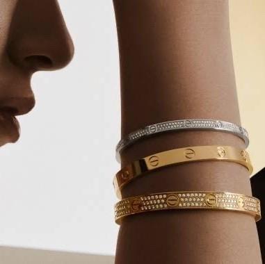 Love bracelet, small model, 18K yellow gold, white gold, and rose gold set with 177 brilliant-cut diamonds totaling 0.95 carat. Sold with a screwdriver. Width: 3.65 mm. Ready size 16-19( chat untuk size)